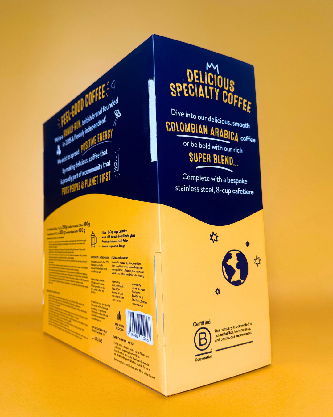Crafted to bring a little joy to the everyday, this set brings together TrueStart's delicious speciality grade ground coffee with the most effortless brew method. Choose your brew from either our smooth Energising Colombian or our bold Super Blend, both full of flavour lab-test to ensure it's free of nasties, rich in antioxidants and caffeine-regulated. This joyful cafetière makes a smooth, feel-good cup in minutes. No fuss, just proper coffee. Works perfectly with any of TrueStart's specialty grade ground coffee for a deliciously smooth and reliably energising cup.